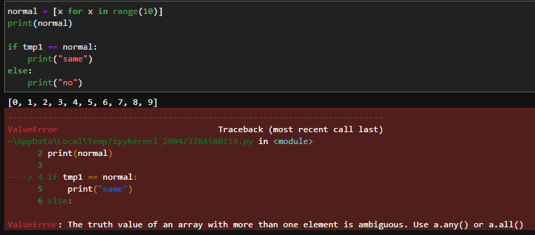 임의의 배열 normal을 만들고, ndarray랑 비교를 했더니? 에러가 납니다. 비교 자체가 성립하지 않는군요!.