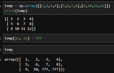 이렇게 직접 지칭하는 Numpy배열 원소를 Numpy배열로 변경할 수 있다면, Numpy배열 원소의 일부만을 변경할 수도 있지 않을까요? 바로 위에 언급해드린 슬라이싱 방법으로 말이죠.