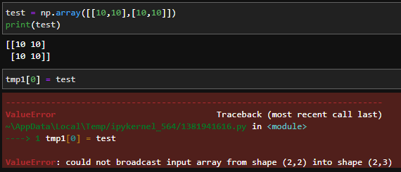 2 X 3 배열에 2 X 2 배열을 이용해서 값을 변경해보려 했더니 ValueError가 나옵니다.