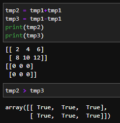 tmp3 Numpy배열은 모두 0으로 구성되어있으므로, tmp2의 값이 모두 tmp3의 값들보다 크죠? 그래서 모두 True로 구성된 배열이 생성된 것입니다.