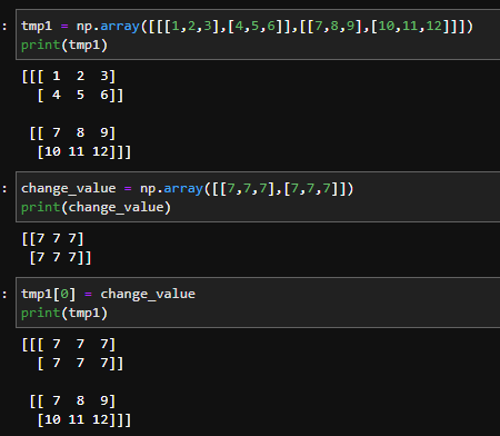 tmp1이라는 Numpy배열을 만들고, 그 중에 0번째 인덱스 값인 [[1,2,3],[4,5,6]]을 한 번에 변경해 보았습니다.
