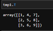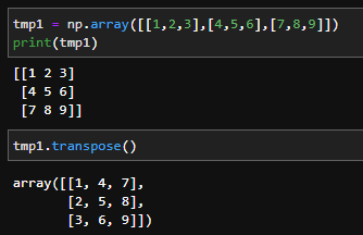 transpose 함수를 사용하시면, 대각선을 기준으로 값들이 대칭됩니다. 이를 tmp1의 '전치 행렬'이라고 부릅니다.