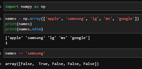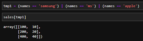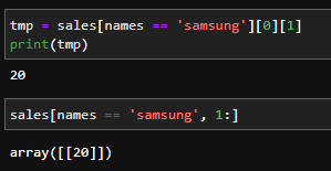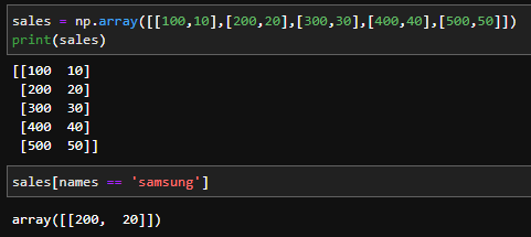 바로 이렇게요. 지금 names == 'samsung' 문장은 위에서 True / False 배열을 반환할 텐데, 이게 sales 배열의 index로 들어가서 True인 index만 나옵니다.