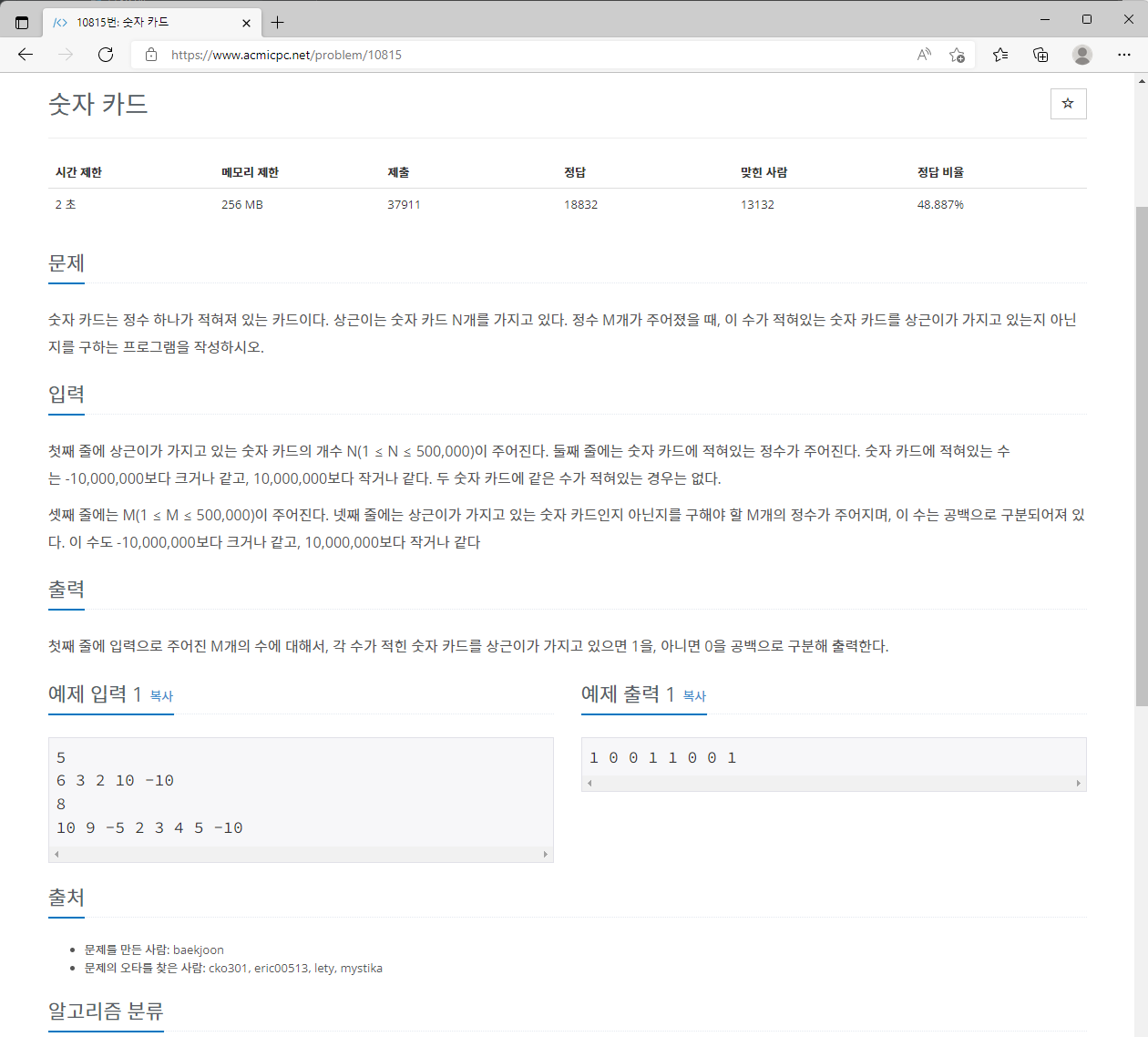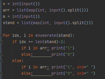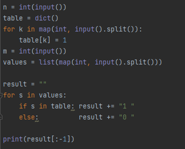 먼저 담아둔 값은 table이라는 이름의 사전형으로 각각 key로 위치시키고 값은 그냥 1로 통일시켰습니다. 어차피 있느냐 없느냐만 확인하면 되고, 갯수는 중복되지 않는다고 문제에서 언급되었으니까요.