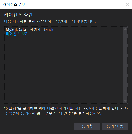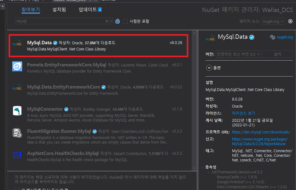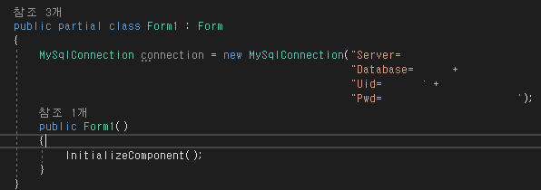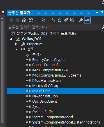 정상적으로 모듈이 받아졌으면 참조 아래에 MySql.Data가 들어간 것을 볼 수 있습니다.