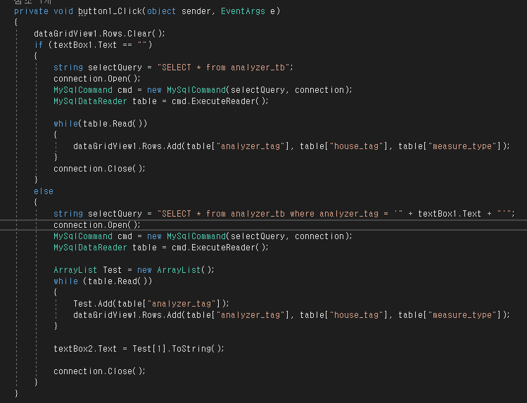 먼저 조건문으로 '검색창에 입력한 데이터가 없으면' SELECT * from analyzer_tb라는 쿼리가 실행됩니다.