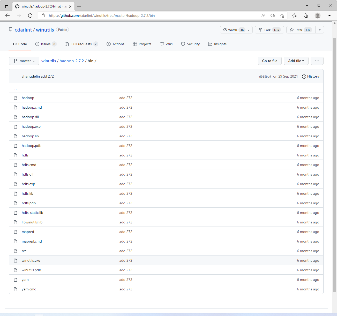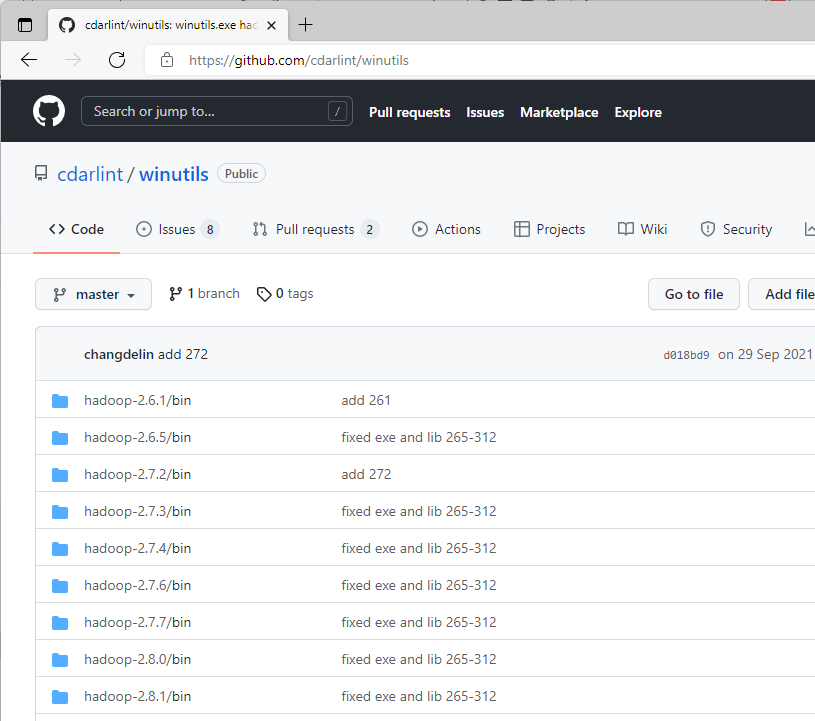그러면 Windows에서 Hadoop인 척을 해보겠습니다. 아래 깃허브로 가시면 굉장히 많은 버전의 파일이 있습니다.
