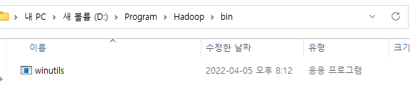 그리고 임의의 경로에 Hadoop 폴더를 만든 후에 그 안에 bin 폴더를 하나 더 만들고 그 안에 winutils.exe 파일을 넣어 주세요.