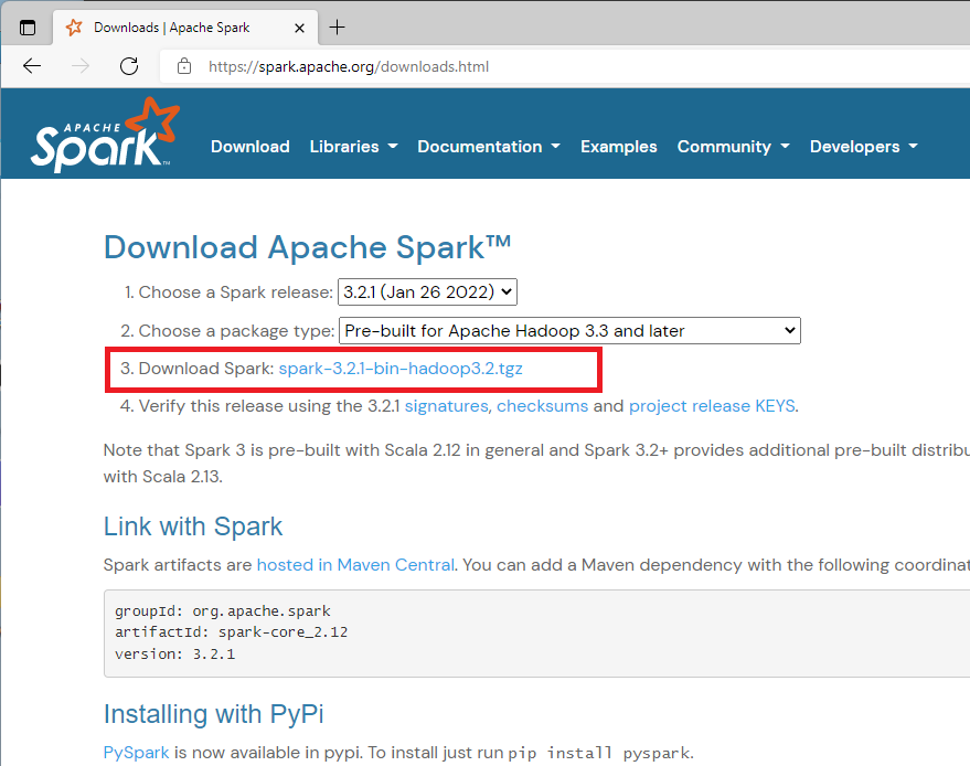 Download Apache Spark™ Choose a Spark release: Choose a package type: Download Spark: Verify this release using the and project release KEYS. Note that Spark 3 is pre-built with Scala 2.12 in general and Spark 3.2+ provides additional pre-built distribut