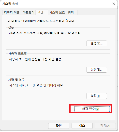 자 이제 환경변수만 등록해 주면 됩니다. 환경변수 창으로 들어가서,