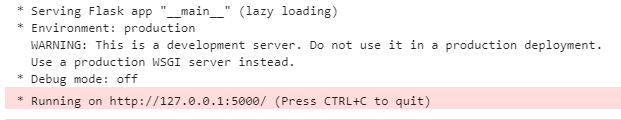 실행 하면 밑에 이렇게 나타납니다. 뭔가 127.0.0.1:5000 여기에서 running 중이다 뭐 이런 느낌이 나죠?