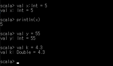 scala의 값은 val [이름] : [타입] = 리터럴 로 정의됩니다.