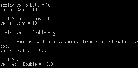 scala는 타입 순위에 기반해, 한 타입의 숫자를 자동으로 다른 타입으로 변환 해 줄 수 있다.