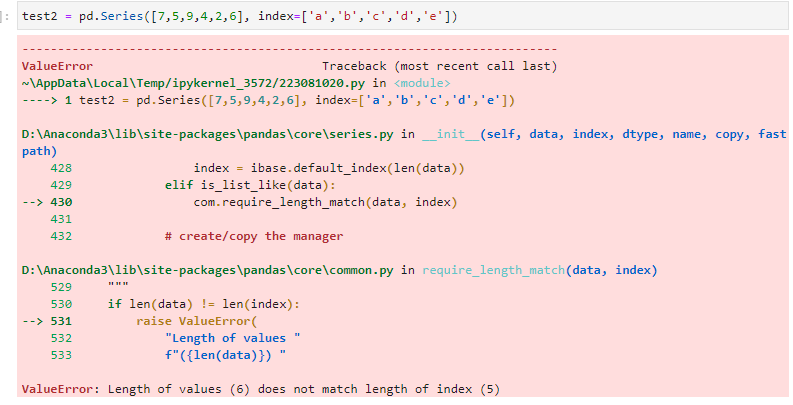 여기서 주의할 점은, data 갯수와 index 갯수가 일치하지 않으면 아래와 같은 에러를 만나게 됩니다.